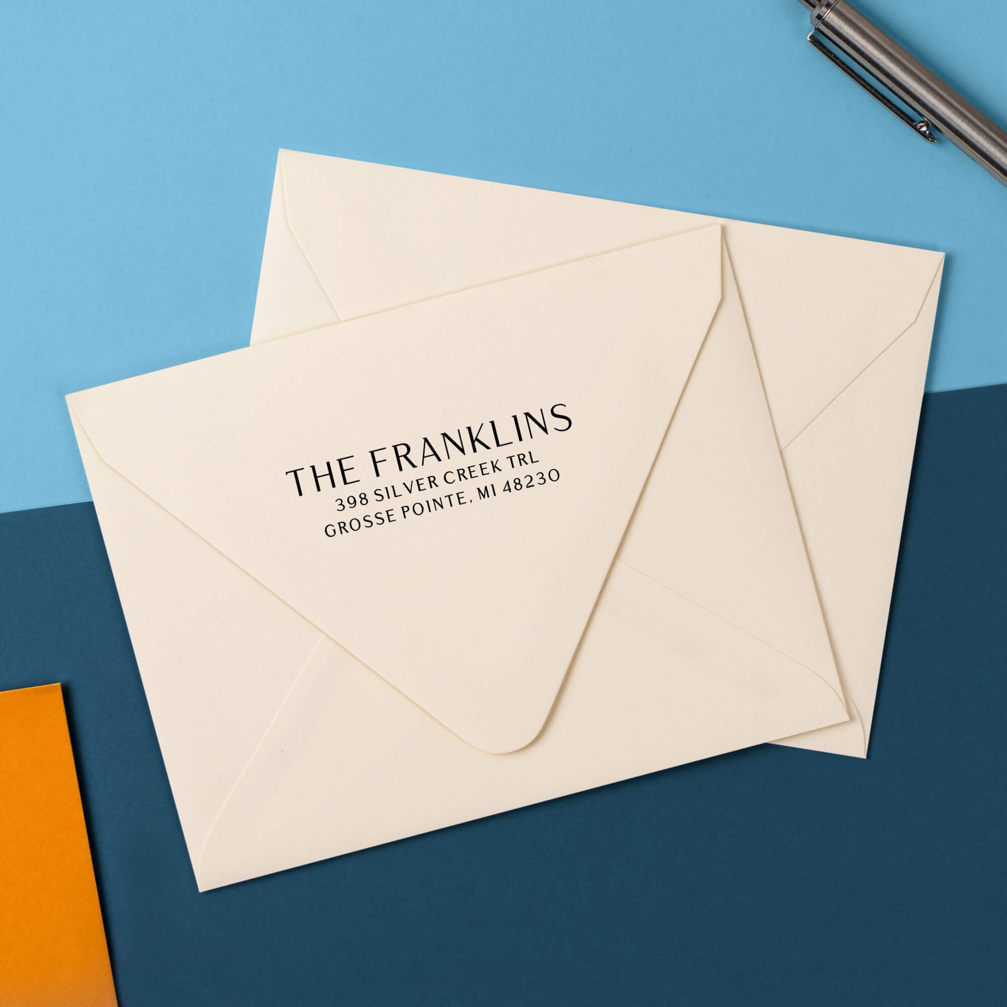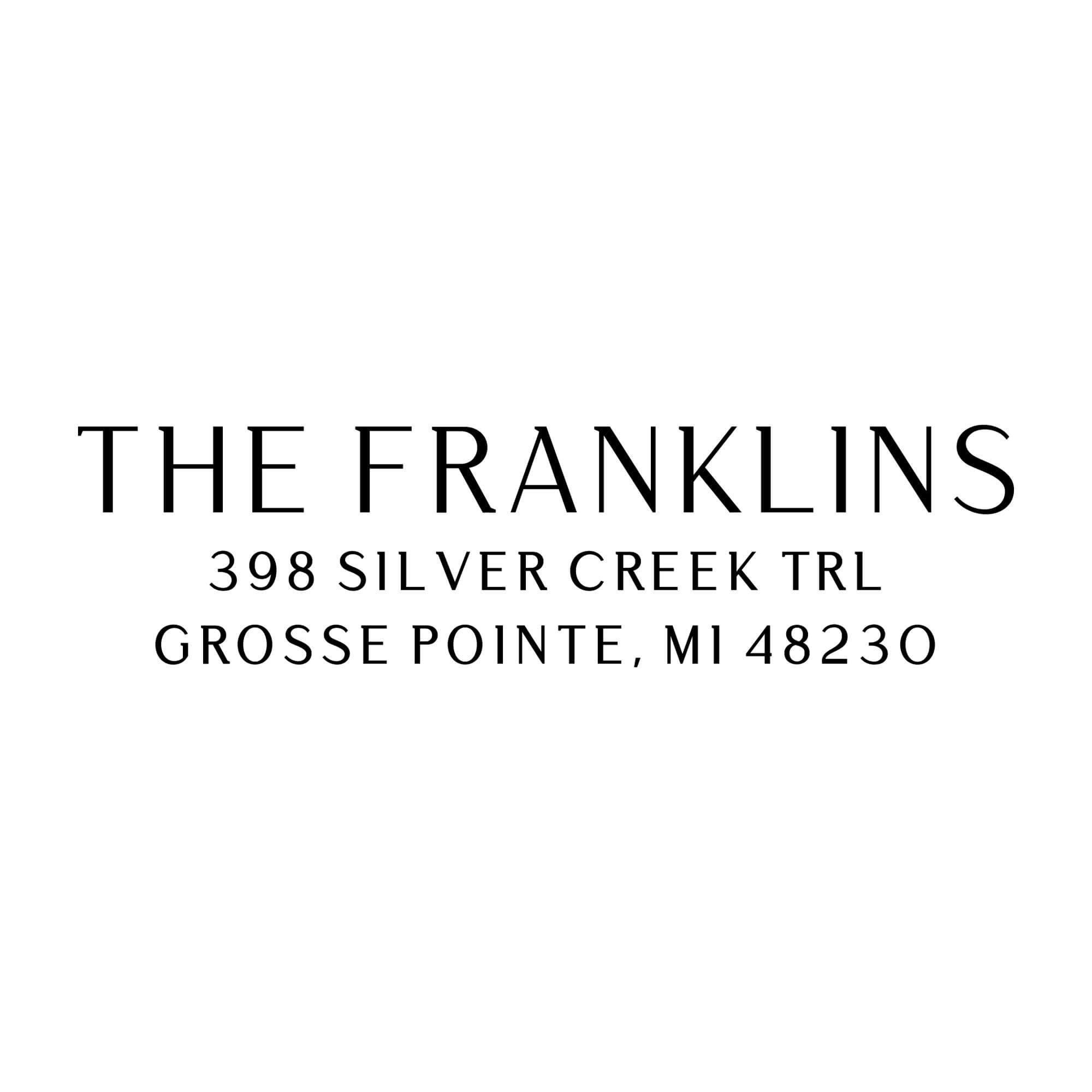 Your mail should look like you. This modern serif custom return address stamp gives your name a clean headline and sets your address with clear spacing, so every envelope looks polished and easy to read. It solves the messy handwriting problem, speeds up large stacks, and brings a consistent look to cards, invitations, and everyday letters.