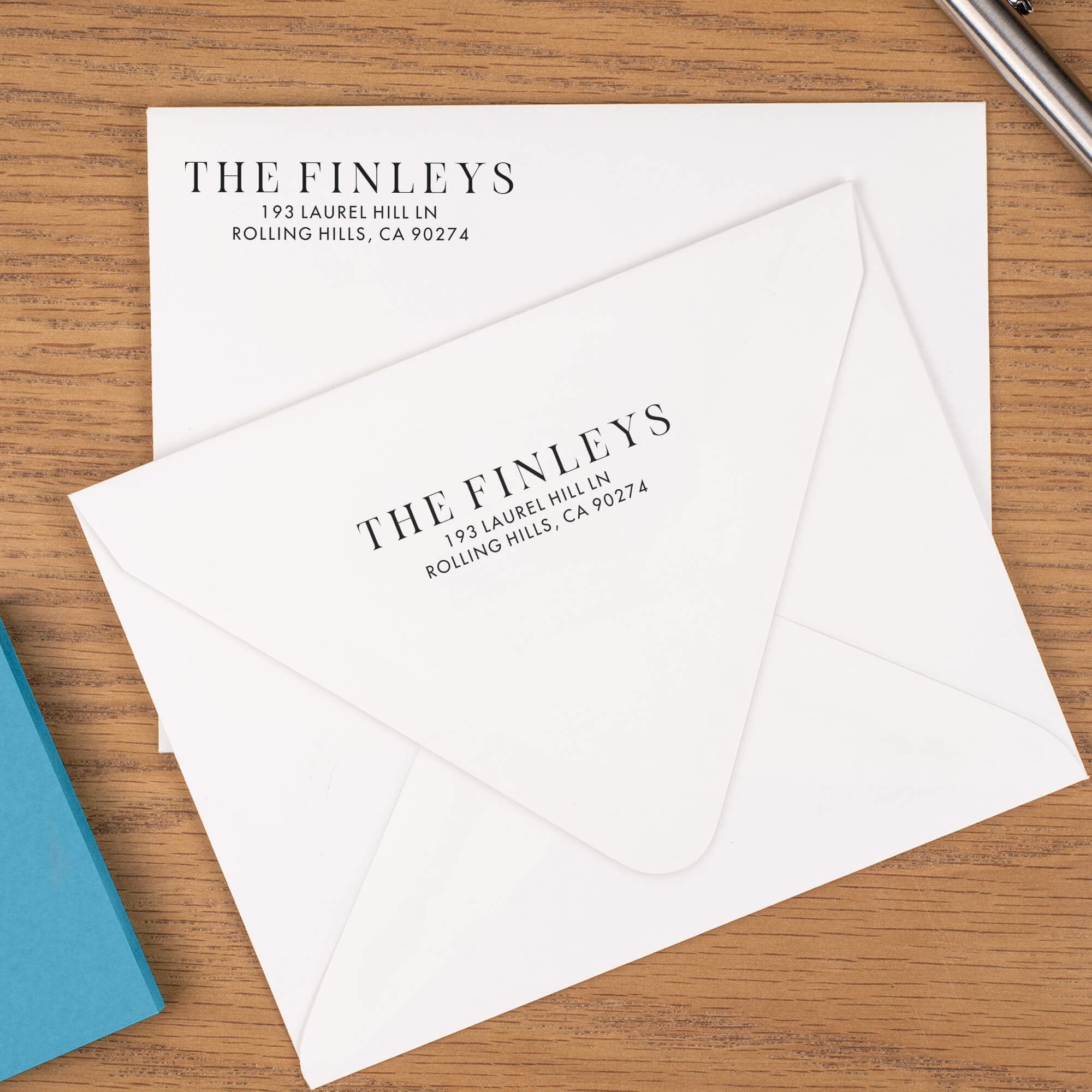 Give every envelope a crisp, classic finish. This custom address stamp sets your family name in refined uppercase with two clean address lines below, so your mail looks intentional and ready to send. It saves time, creates a matching return address on every envelope, and brings a timeless look to cards and letters.