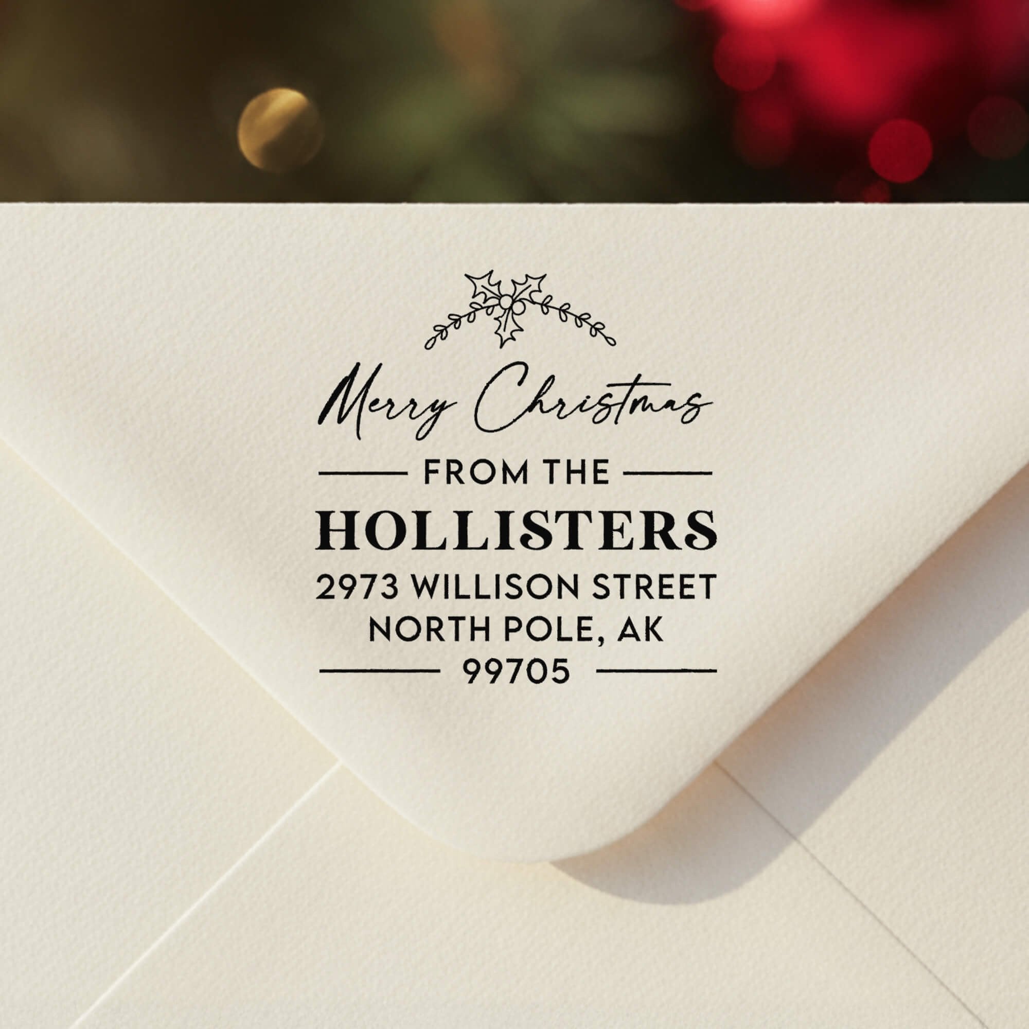 Give your holiday mail a timeless look with our Merry Christmas Address Stamp. Featuring elegant script, bold lettering, and a holly sprig accent, this design creates a polished presentation for every card, letter, or holiday invitation. Personalized with your family name and return address, it’s the perfect way to spread cheer before your greetings are even opened.