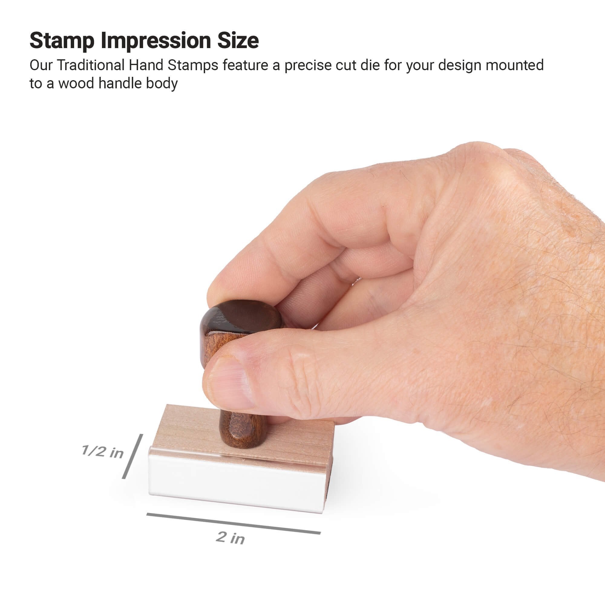 Our traditional hand stamps are a classic way to efficiently imprint your personalized designs. Your custom design is laser engraved onto a rubber die and precisely secured onto each solid wood stamp body. Made from the highest quality workmanship, our wood handle stamps are made to last.