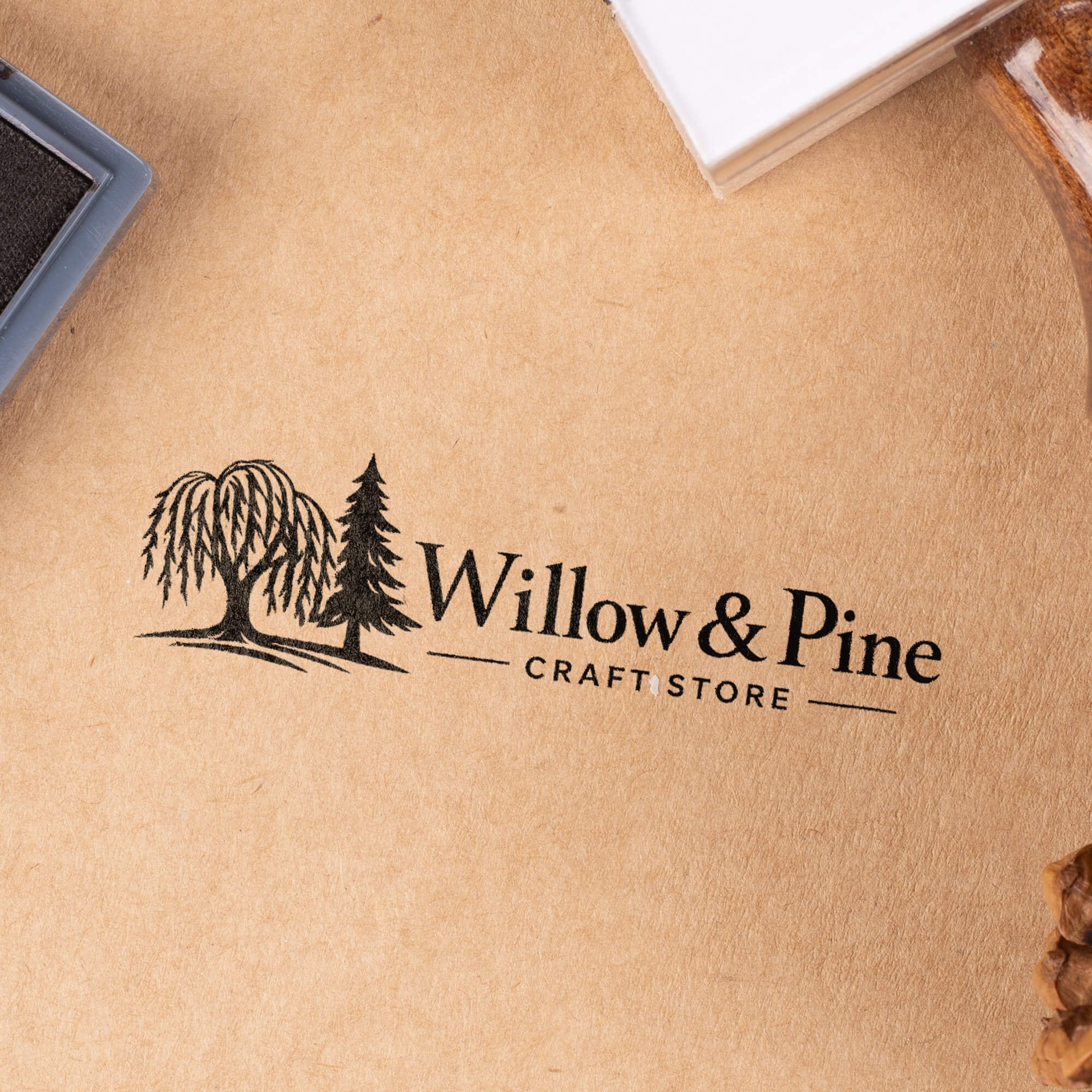 - Laser engraved rubber stamp attached to solid wood base