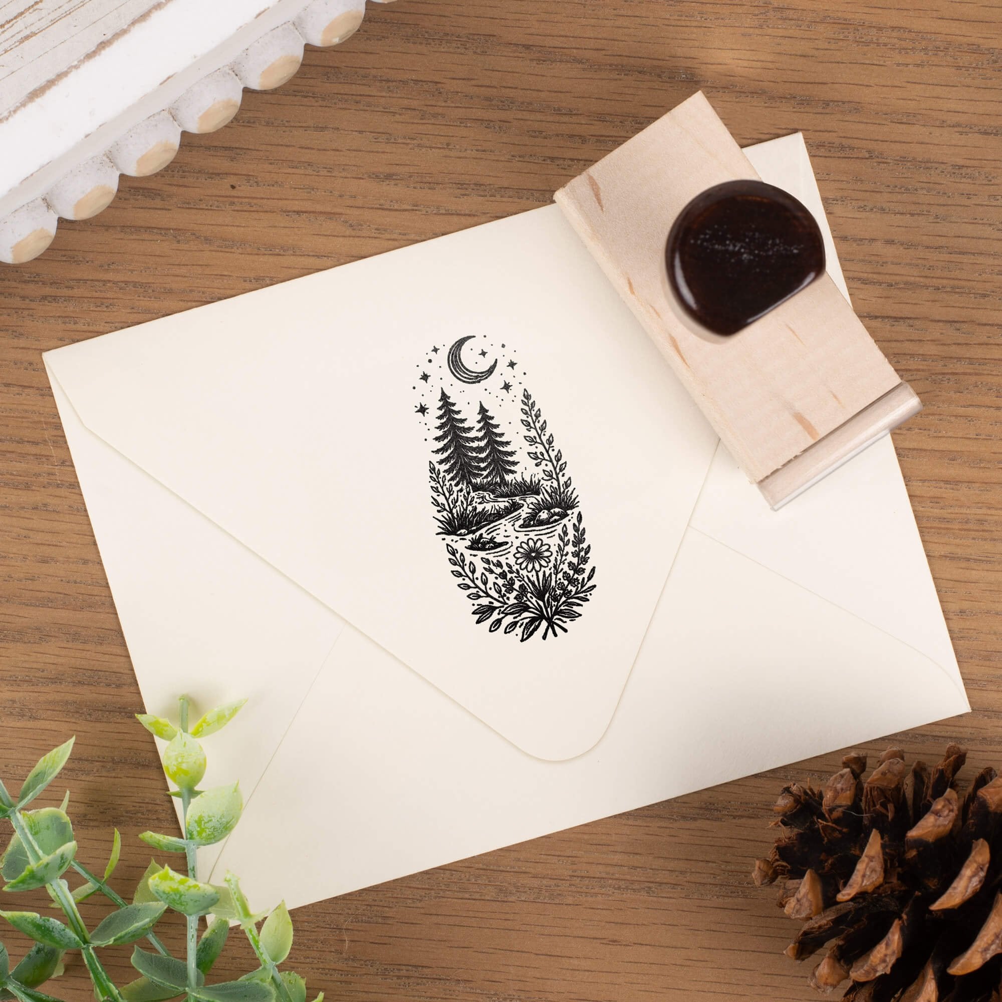 - Laser engraved rubber stamp attached to solid wood base