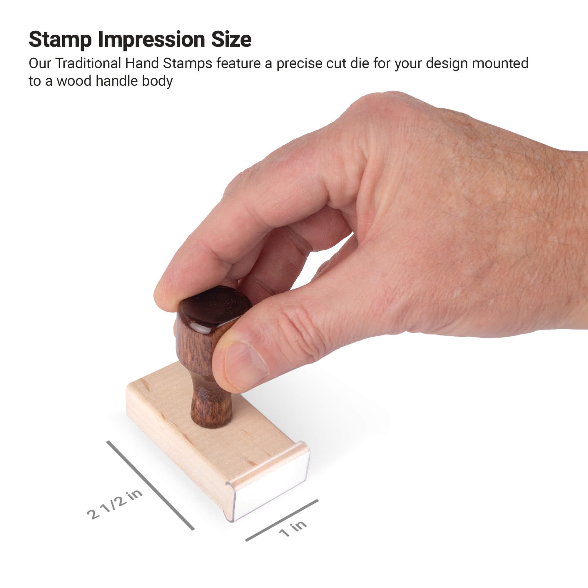 Our traditional hand stamps are a classic way to efficiently imprint your personalized designs. Your custom design is laser engraved onto a rubber die and precisely secured onto each solid wood stamp body. Made from the highest quality workmanship, our wood handle stamps are made to last.