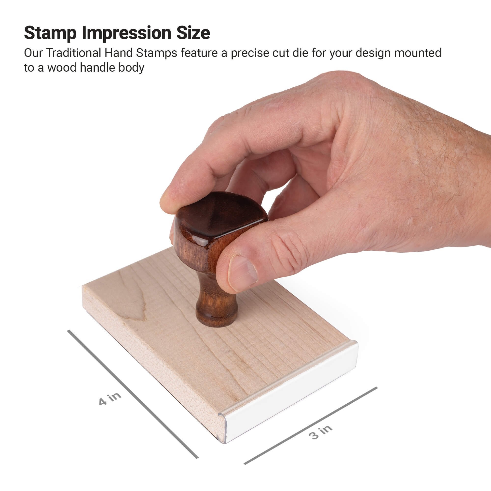 - Wood handle stamp impression measures approx. 4" x 3"