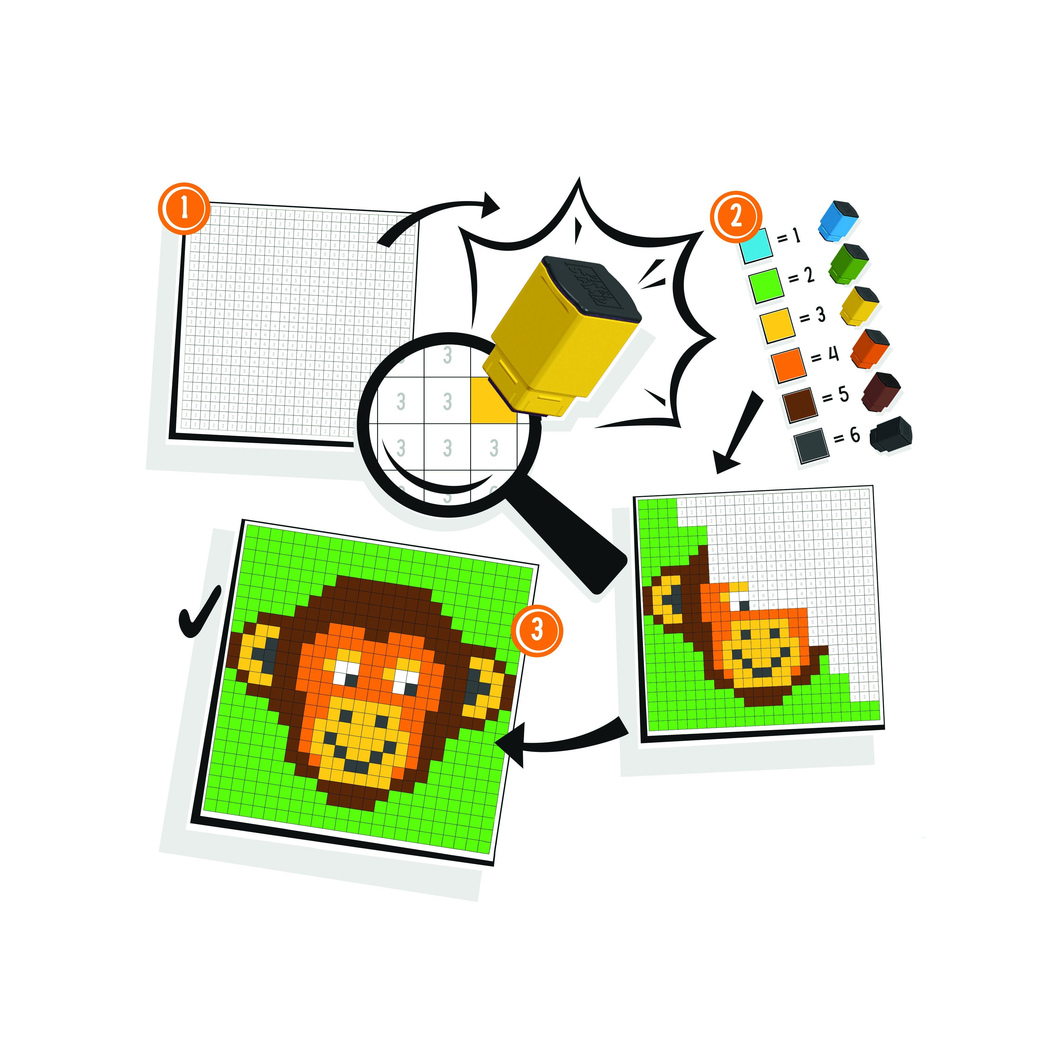 Each pixel in the template is labeled with a number. Children simply match the number to the correct colored stamp and press down to reveal the image. The result is a fun, confidence-building activity that keeps kids engaged while strengthening important early learning skills.