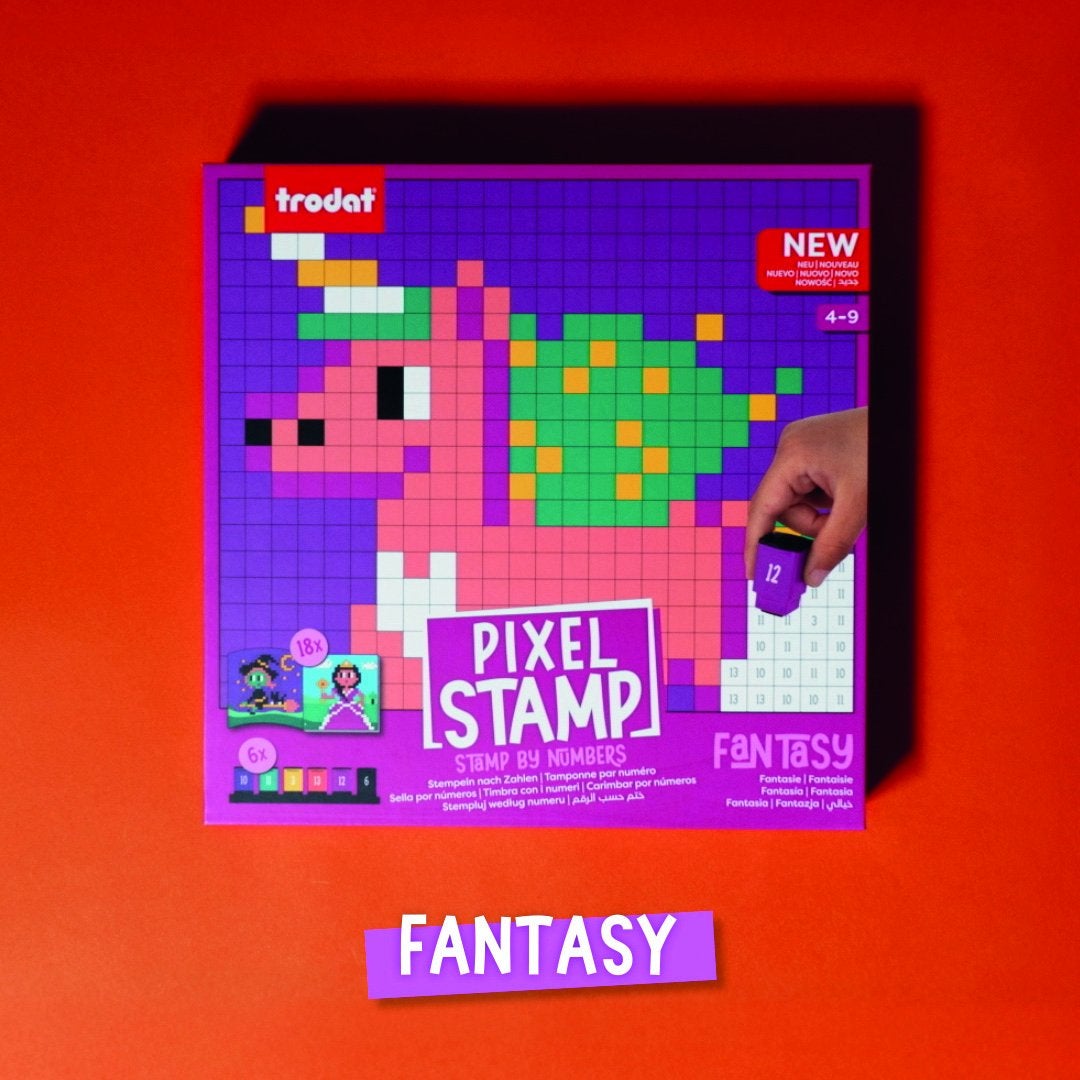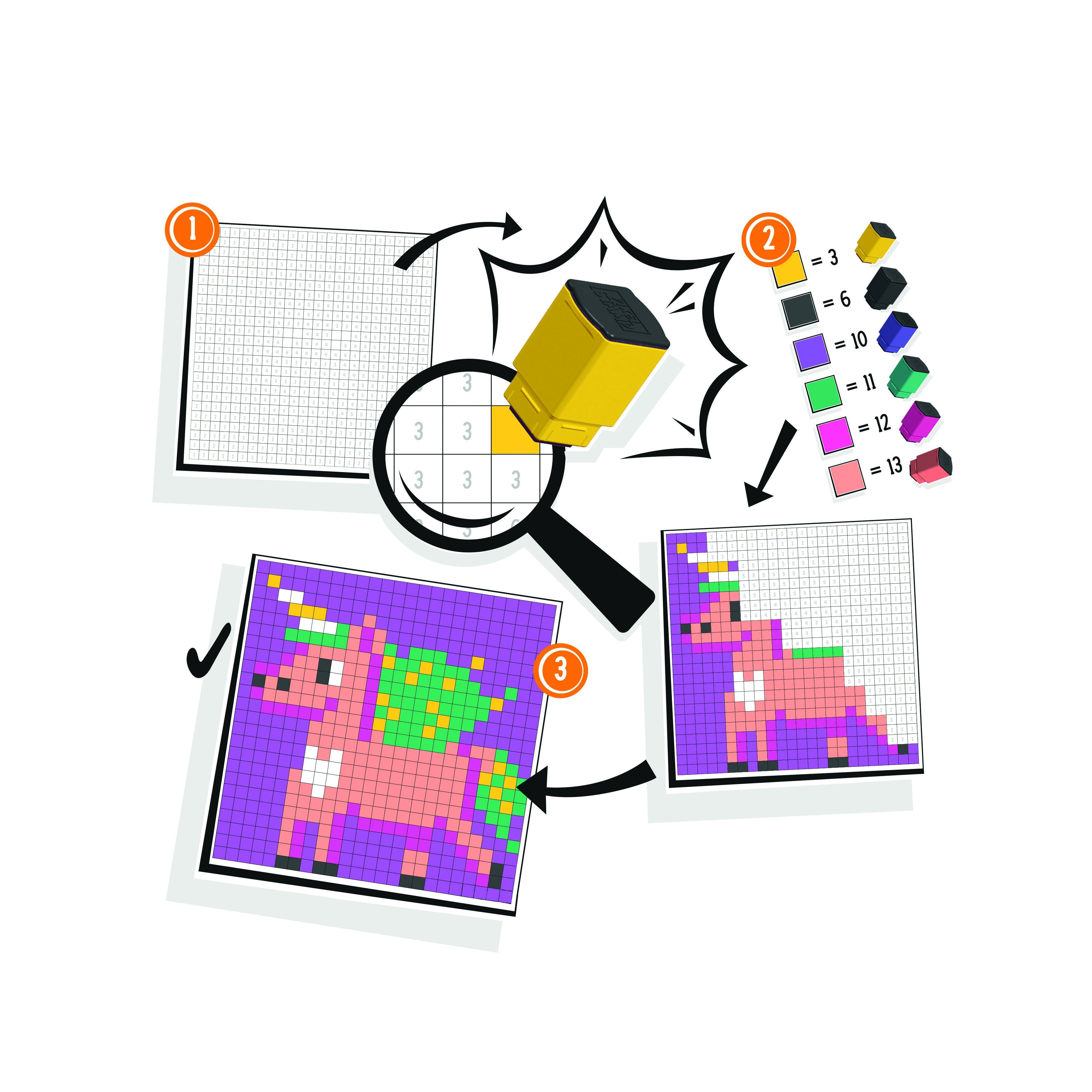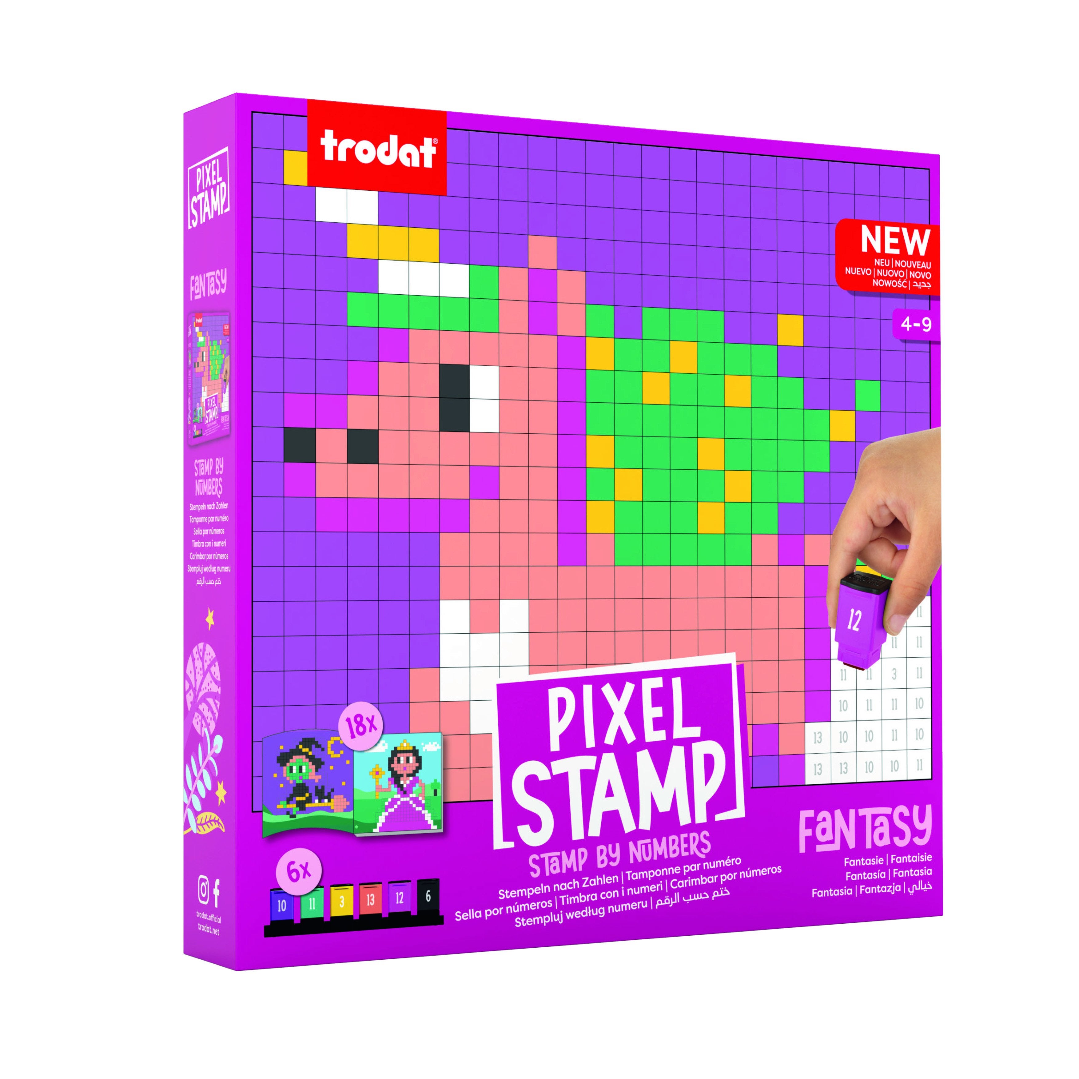 Unleash dragons, unicorns, and magical creatures with every press. The Trodat Pixel Stamp Fantasy Kit transforms imagination into structured creativity through an easy stamp-by-numbers pixel art system. Children match numbered pixels to colorful stamps to reveal 18 enchanting designs.